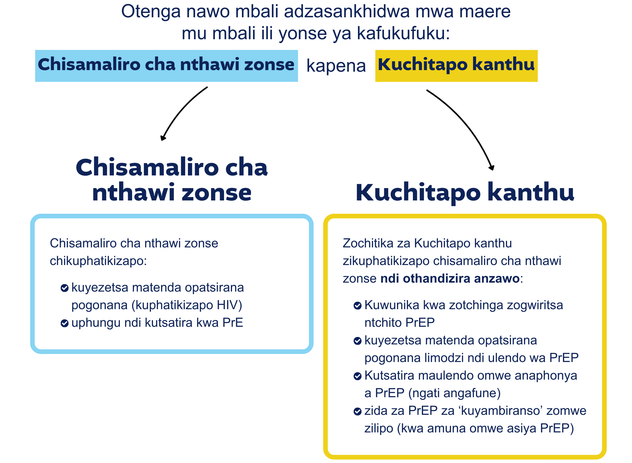 PrEP amayimira “pre-exposure prophylaxis”. Prophylaxis amatanthauza kupewa, kotero pre-exposure prophylaxis imatanthawuza kupewa musanawonekere. PrEP ndi njira yopewera kachirombo ka HIV komwe kumwa mankhwala oletsa kachilombo ka HIV asanakumane ndi kachilombo ka HIV kumathandiza kupewa HIV mwa anthu omwe alibe kachilomboka. Pali mitundu ingapo ya PrEP ndipo zonse zikupezeka ku Chipatala cha matenda opatsirana pogonana cha Bwaila.